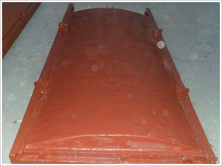 門體一般采用面板與加強(qiáng)肋的結(jié)構(gòu),面板可做平面或拱形。門體一般整體鑄造和機(jī)加工,但尺寸較大的可采用分塊組成式。門體上一般采用整體式金屬止水,兼作支承滑塊,金屬止水用同材料制作的沉頭螺釘緊固在門體上,螺釘頭部與止水工作面一起精加工,一些尺寸較大的也可“p”形橡皮止水。
